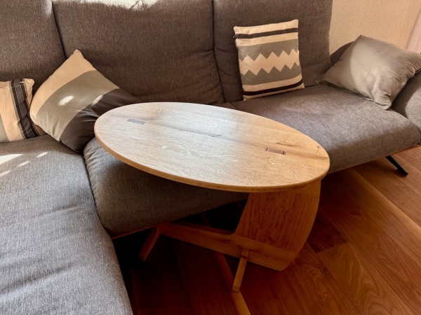 Handgefertigter Couchtisch aus Schweizer Eiche. Dieser Tisch enthält keine Schrauben und wurde ausschließlich mit handgeschnitzten Verbindungen gebaut: 2 Schwalbenschwanzverbindungen, 2 verkeilte Zapfenverbindungen und 1 fixierte Überblattung. Die Keile und Stifte sind aus Nussbaum. Dieser Tisch passt über ein Sofa, das nicht höher als 45 cm ist. Er eignet sich hervorragend, um ein Getränk abzustellen, während man das Spiel schaut. Die Form dieses Tisches ist nicht neu, aber die Konstruktionsmethode mit den Verbindungen ist es. Oberflächenbehandelt mit Kastanien-Hartwachsöl. Dieser Tisch wurde stark von Shaun Boyd Made This inspiriert.