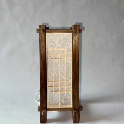 This Shoji lamp is handcrafted from a striking piece of special walnut, giving it a rich, warm tone. The top features a Kumiko lattice, and each side is fitted with Shoji panels made from maple wood, backed with your choice of white, pink, or blue handmade Japanese Awagami Unryu paper. Kumiko is a traditional Japanese woodworking art that involves fitting tiny wooden parts together without any nails or screws.